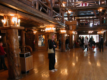 Somehow it channels the Titanic and the elegance of a bygone era. Vacationers gaping. Lights twinkling. Piano keys plinking. Yet no sea-sickness or disasters lurk aboard this century-old structure, Old Faithful Inn.