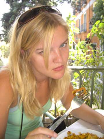 Annie trying to identify a piece of seafood in her paella--probably squid--in San Lorenzo
