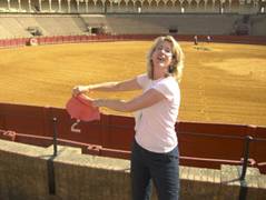 Jean ready to fight bulls in Sevilla, using her hat for a cape