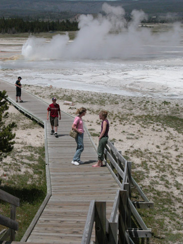 Three years ago, we visited Yellowstone’s Old Faithful as part of our whirlwind family “Heritage Tour” of places our grandparents lived and loved. We saw folks on cabin porches, sitting, doing little else. We wanted that. Today we have our own stay of days at an Old Faithful cabin; we’ve hardly left the area.