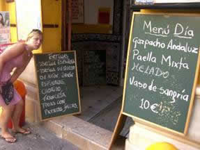 Other than our language issues, our greatest challenge was probably la comida, or the food. Spanish food is ham and more ham, with other meats, eggs and unidentifiable seafood thrown in. I carried a Spanish-English dictionary but found we used it only at restaurants to make sure we weren’t eating something scary. How about some “bulls-tail soup” or “meat-filled pastries” or “fried eggs of the bull”? (And not the kind of eggs you’d use in an omelet.) Annie and I, on the other hand, are unintentional vegetarians: we’ll eat meat but prefer almost anything else. Plus Annie had already been eating serious Spanish food for six weeks, prepared by her over-worked young host mother with a penchant for canned goods.
