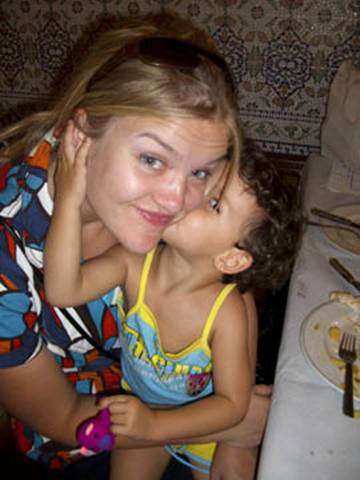 Annie getting a kiss from her host sister Noelia on our return to Segovia
